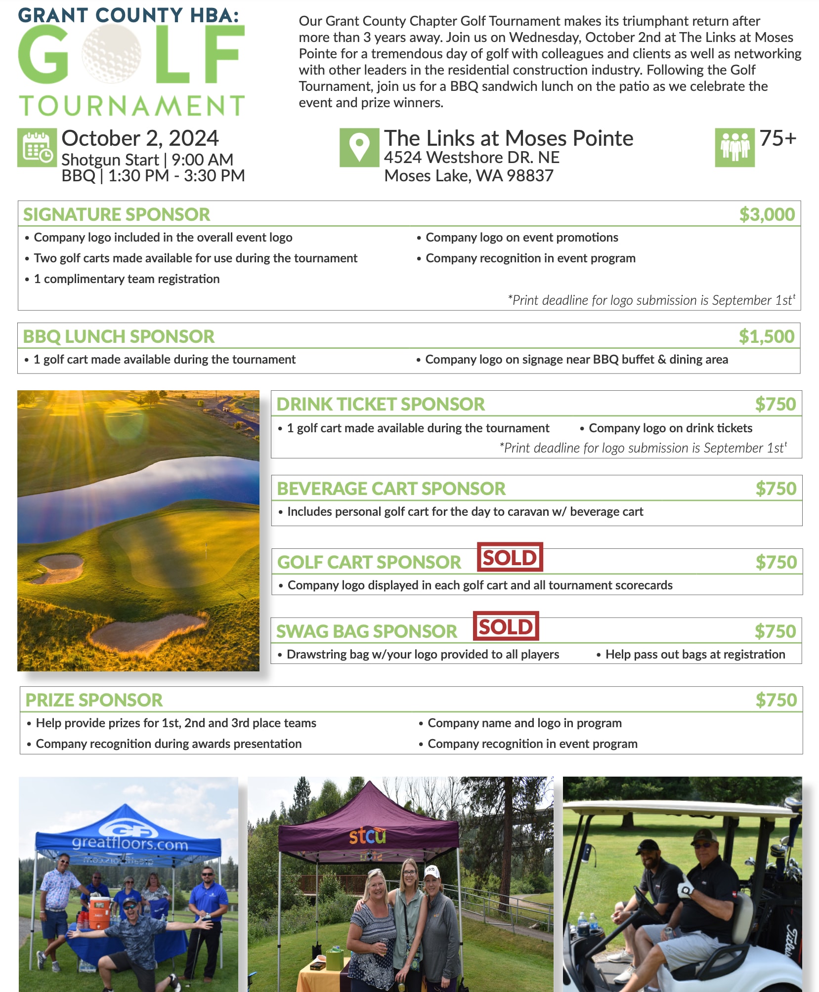 Our Grant County HBA Golf Tournament makes its triumphant return after more than 3 years away. Join us on Wednesday, October 2nd at The Links at Moses Pointe for a tremendous day of golf with colleagues and clients as well as networking with other leaders in the residential construction industry. Following the Golf Tournament, join us for a BBQ sandwich lunch on the patio as we celebrate the event and prize winners. Hosted by the Grant County Chapter and the SHBA, all members of the Grant County community are welcome to participate in this event as golfers and/or sponsors!